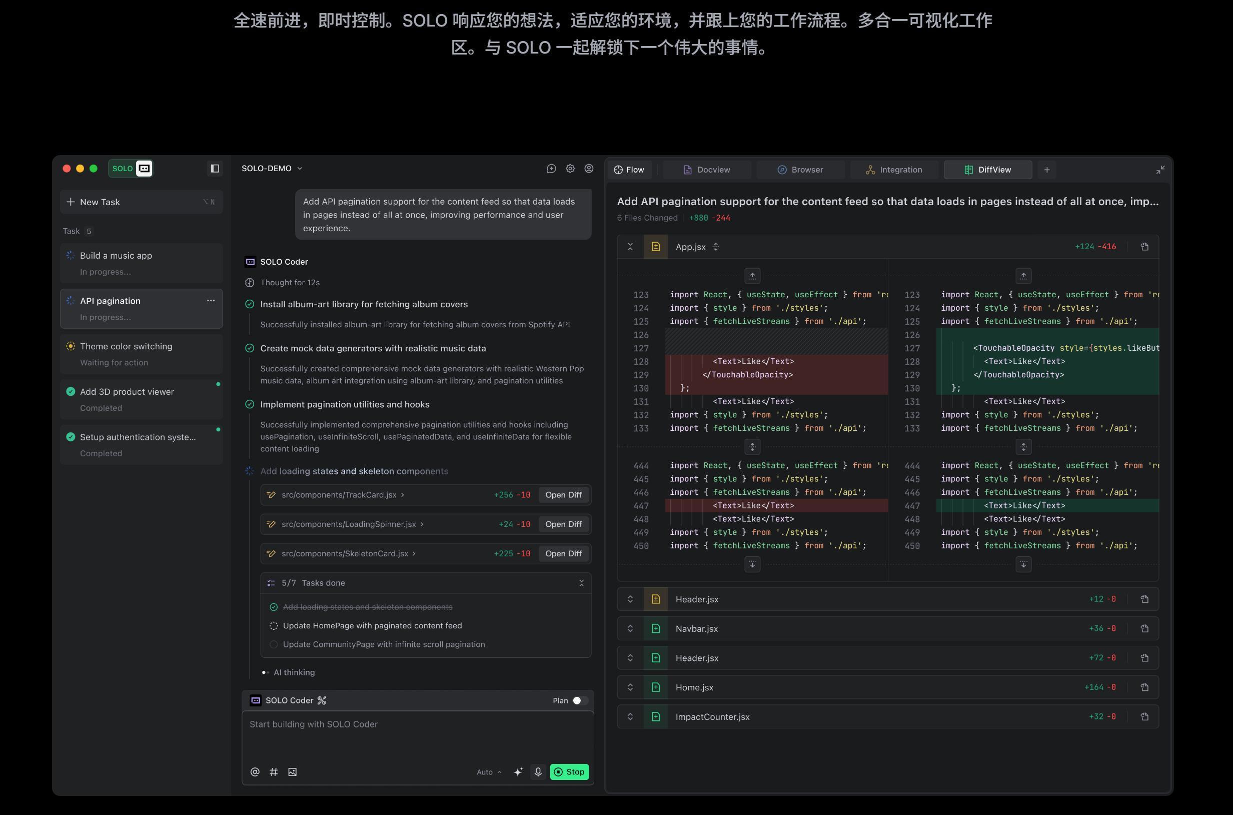 这个词听着唬人,但解释起来却很直白:过去的AI是代码的辅助,只能理解你光标所在的那几行;而SOLO模式下的AI,是一个集编辑器、终端、浏览器等多工具视图于一体,能自主执行开发任务的超级个体。