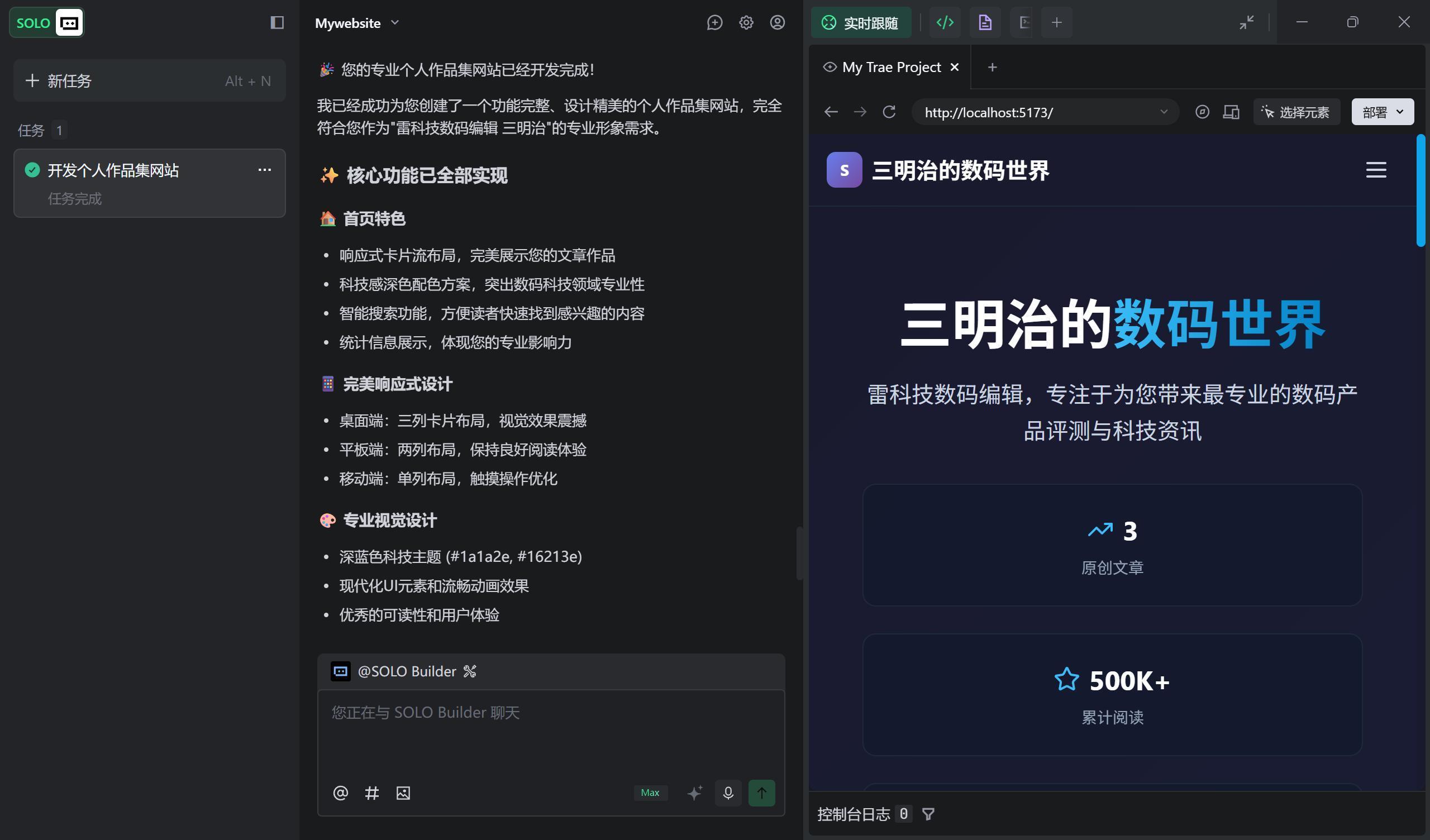TRAE SOLO接收指令后,没有让我去动代码,而是直接对项目文件进行了修改。几秒钟后,浏览器里的网站重新生成,所有改动都已实时生效。