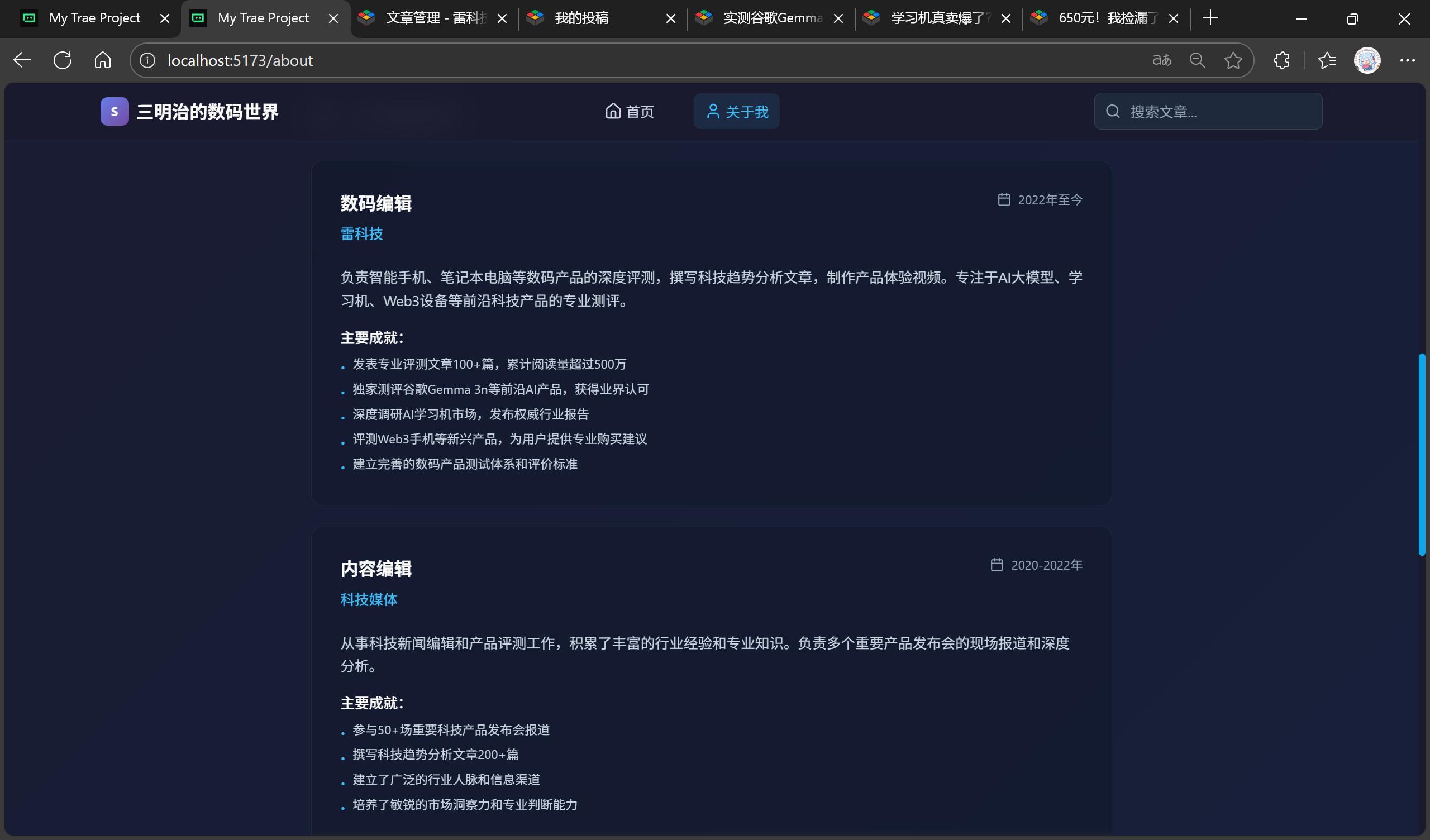 首先,我在TRAE SOLO的对话框里,用语音输入需求:“帮我做一个作品集网站,用来展示我的科技数码文章。需要有一个首页,能用卡片流的形式展示文章列表,点击卡片能进入文章详情页。另外,再做一个‘关于我’的页面,介绍一下我自己。”