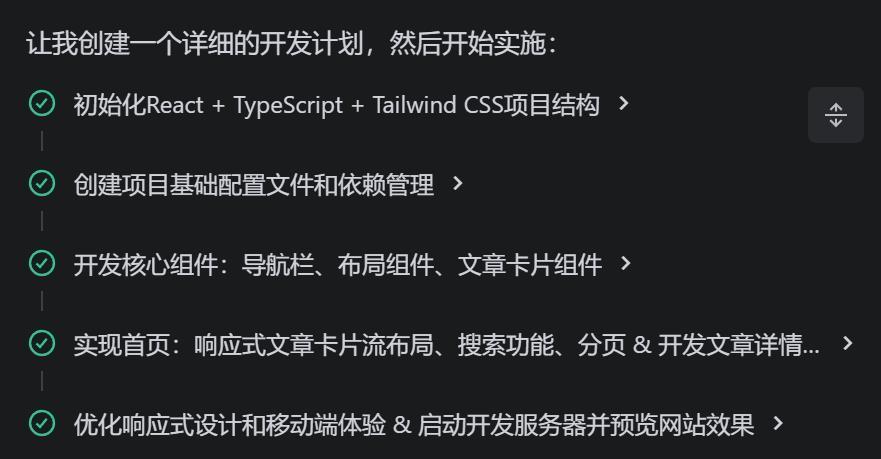 点击同意后,屏幕中间的面板开始自动刷新,出现了“初始化项目”、“创建配置文件”、“开发核心组件”、“实现首页功能”、“优化响应设计等一系列我看不懂但感觉很厉害的任务进度。