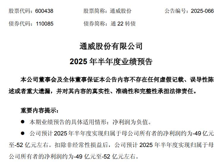 7月14日通威股份公告,预计2025年半年度实现归属于母公司所有者的净利润约为-49亿元至-52亿元左右。上年同期净利润为-31.29亿元。报告期内,尽管光伏装机规模增长,但行业供需失衡导致产品价格低迷,公司经营出现亏损。